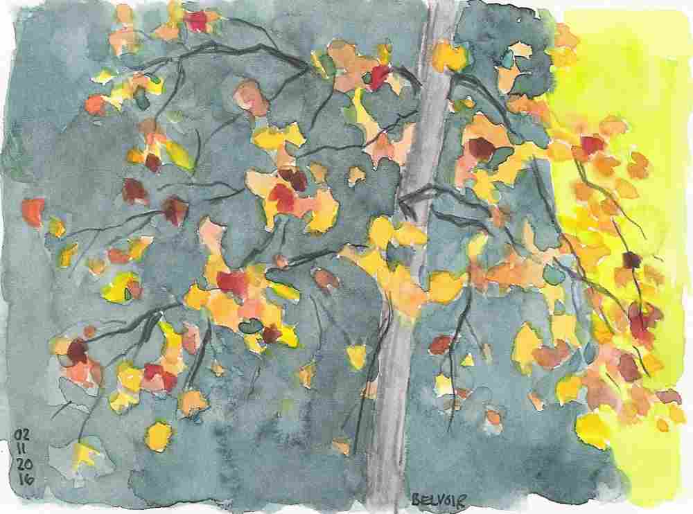 Eben erst vor einer Woche ging ich in München am frühen Samstagmorgen der Isar entlang spazieren. In den schier endlosen Alleen hingen noch bunte Blätter in den Bäumen. Jedoch kündigte sich mit frostigen Minustemperaturen der Winter an. Einige kräftige Windstösse würden jetzt reichen, um die Farbenpracht zu verwirbeln und wegzuwischen. Danach würden für lange Zeit moderate Klänge in Grau den Takt geben. Zuvor wollte ich dieses Leuchten noch einmal festhalten. Es war so kalt, dass ich schnell zeichnen musste, wenn ich danach nicht durchfroren sein wollte.